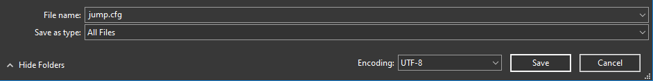 3. Bu dosyayı \”ad.cfg\” olarak kaydedin, burada \”ad\” tercih ettiğiniz herhangi bir isim olabilir, örneğin \”jump.cfg\” (mutlaka .cfg uzantısını eklemelisiniz) ve bunun \”herhangi bir dosya\” formatında kaydedildiğinden emin olun, “metin belgesi” değil.